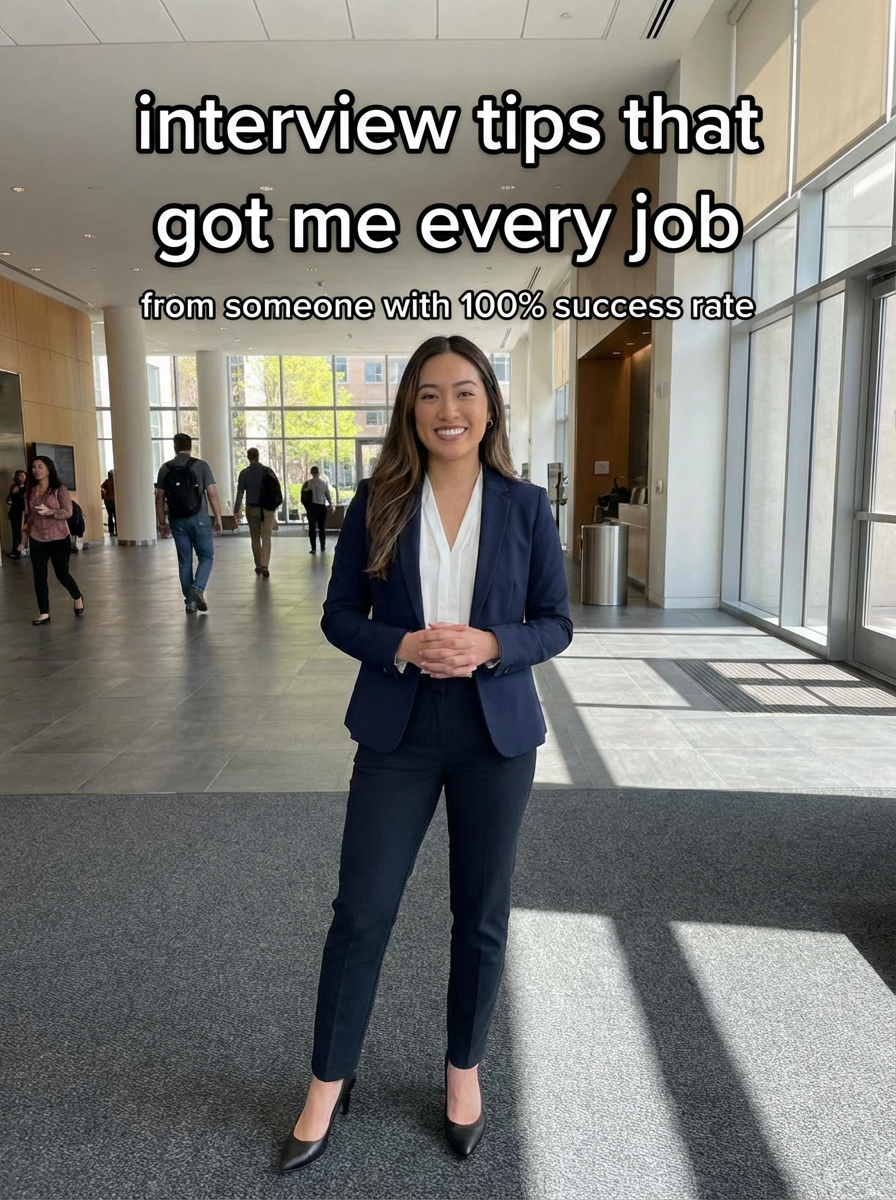 model in professional interview outfit in office building lobby, confident posture, professional lighting. TikTok text overlay: "interview tips that got me every job" smaller text: "(from someone with 100% success rate)" , do not show tiktok interface