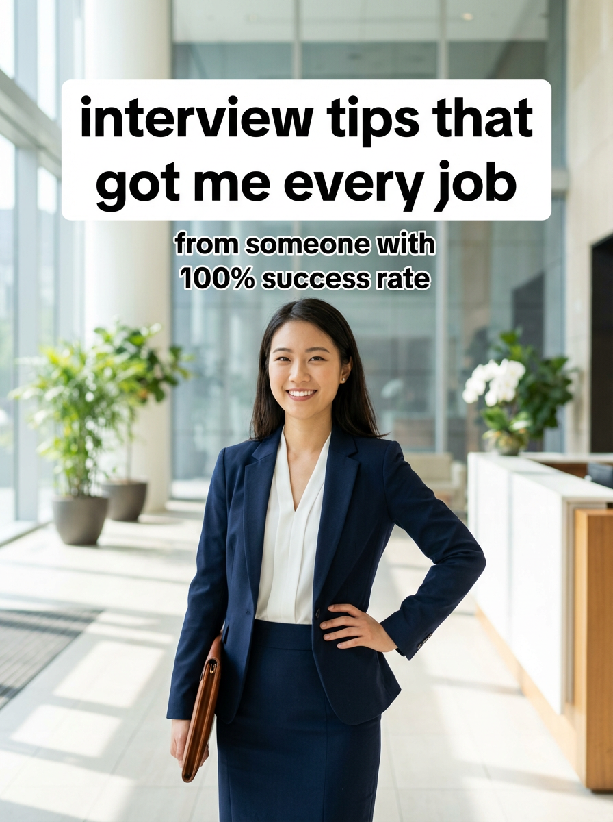 model in professional interview outfit in office building lobby, confident posture, professional lighting. TikTok text overlay: "interview tips that got me every job" smaller text: "(from someone with 100% success rate)" , do not show tiktok interface