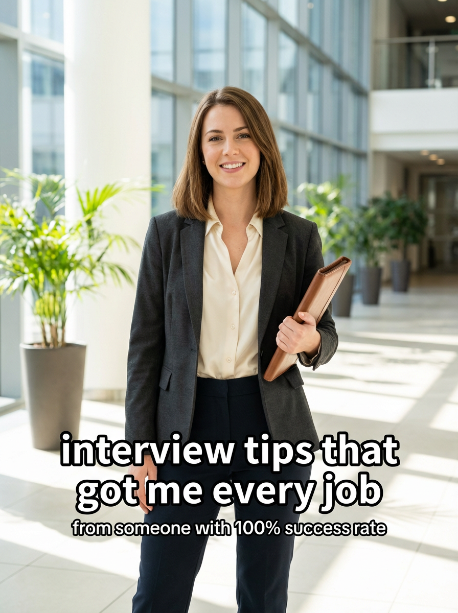 model in professional interview outfit in office building lobby, confident posture, professional lighting. TikTok-style text overlay with white text with black outline: "interview tips that got me every job" smaller text: "(from someone with 100% success rate)" , do not show tiktok interface or logo