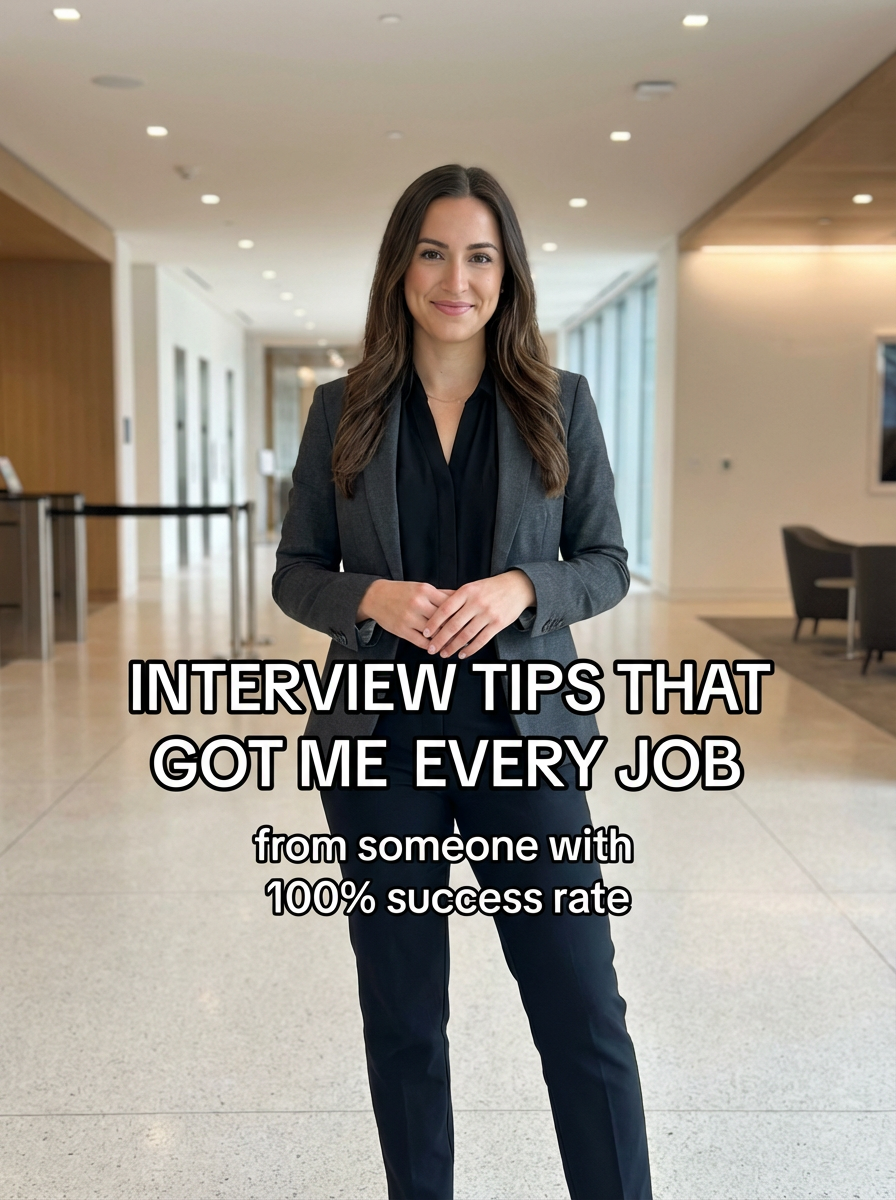 model in professional interview outfit in office building lobby, confident posture, professional lighting. TikTok-style text overlay with white text with black outline: "interview tips that got me every job" smaller text: "(from someone with 100% success rate)" , do not show tiktok interface or logo