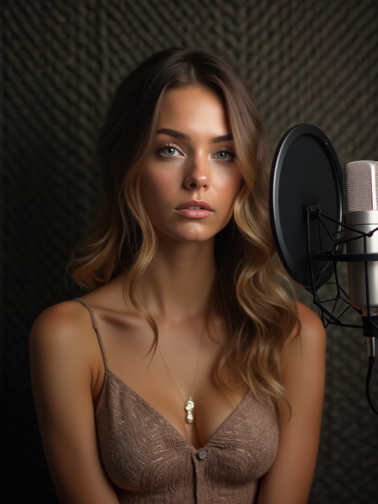 model in professional podcast booth, wearing elegant top , isolation booth setup, professional microphone, focused expression, broadcast quality lighting