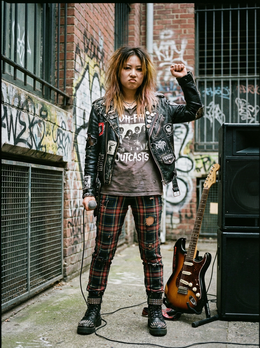 model in punk rock album style, DIY aesthetic, raw energy, rebellious attitude, gritty background