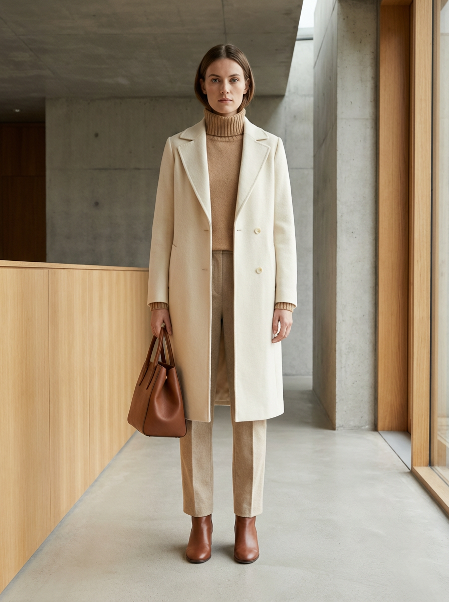 model in quiet luxury layers, cream and tan color palette, quality textures, architectural interior background