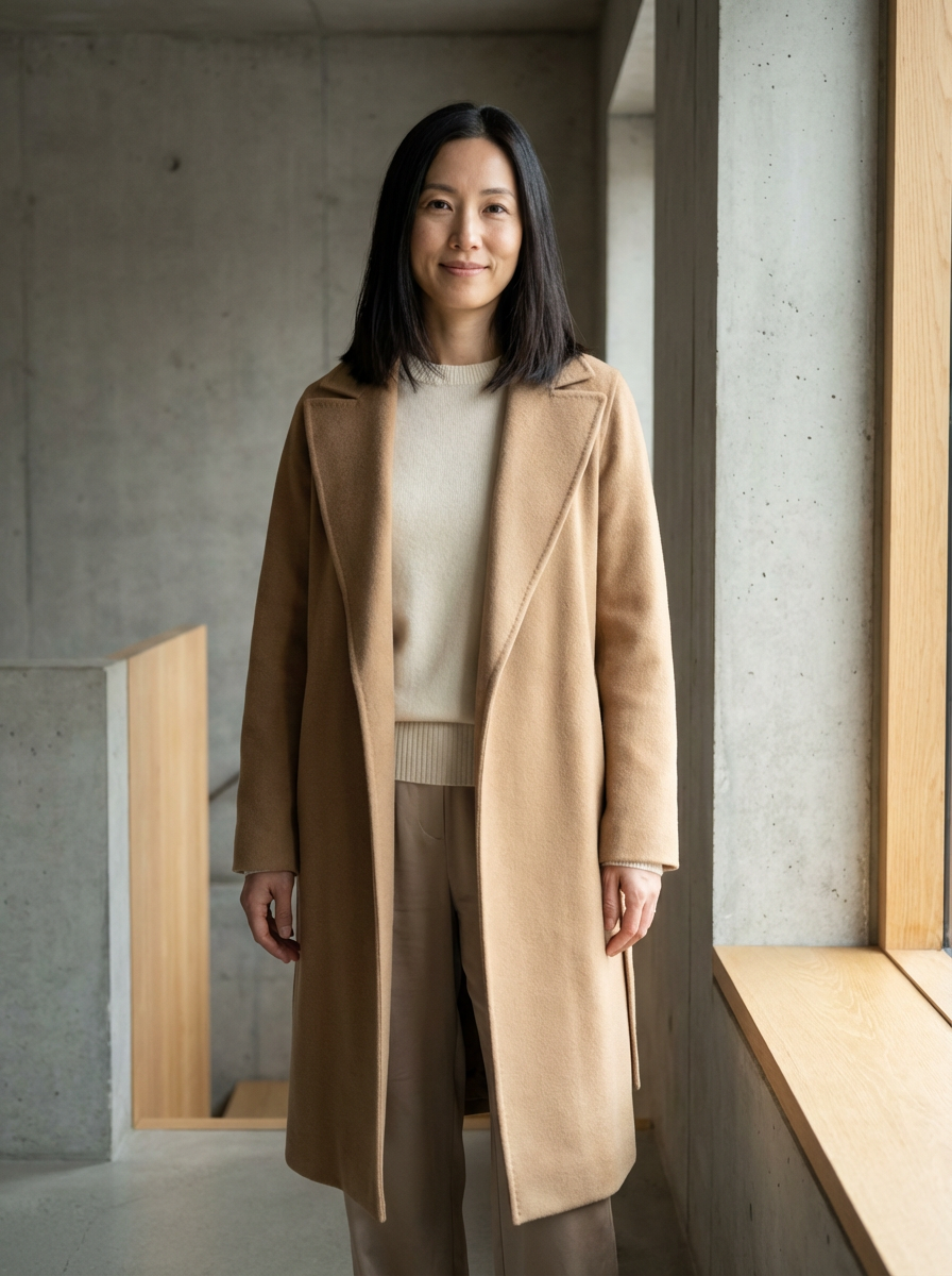 model in quiet luxury layers, cream and tan color palette, quality textures, architectural interior background