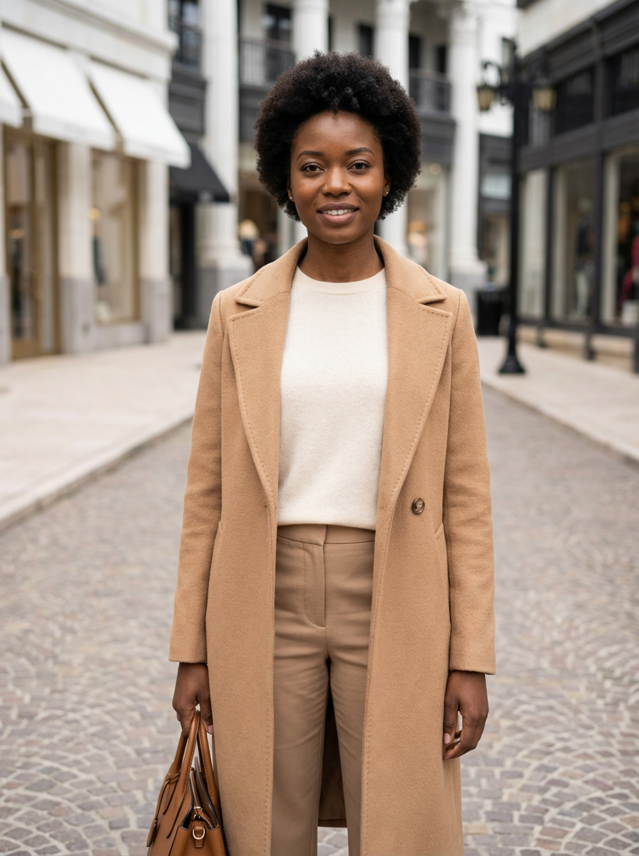 model in quiet luxury outfit, camel coat, quality basics underneath, clean lines, sophisticated urban background