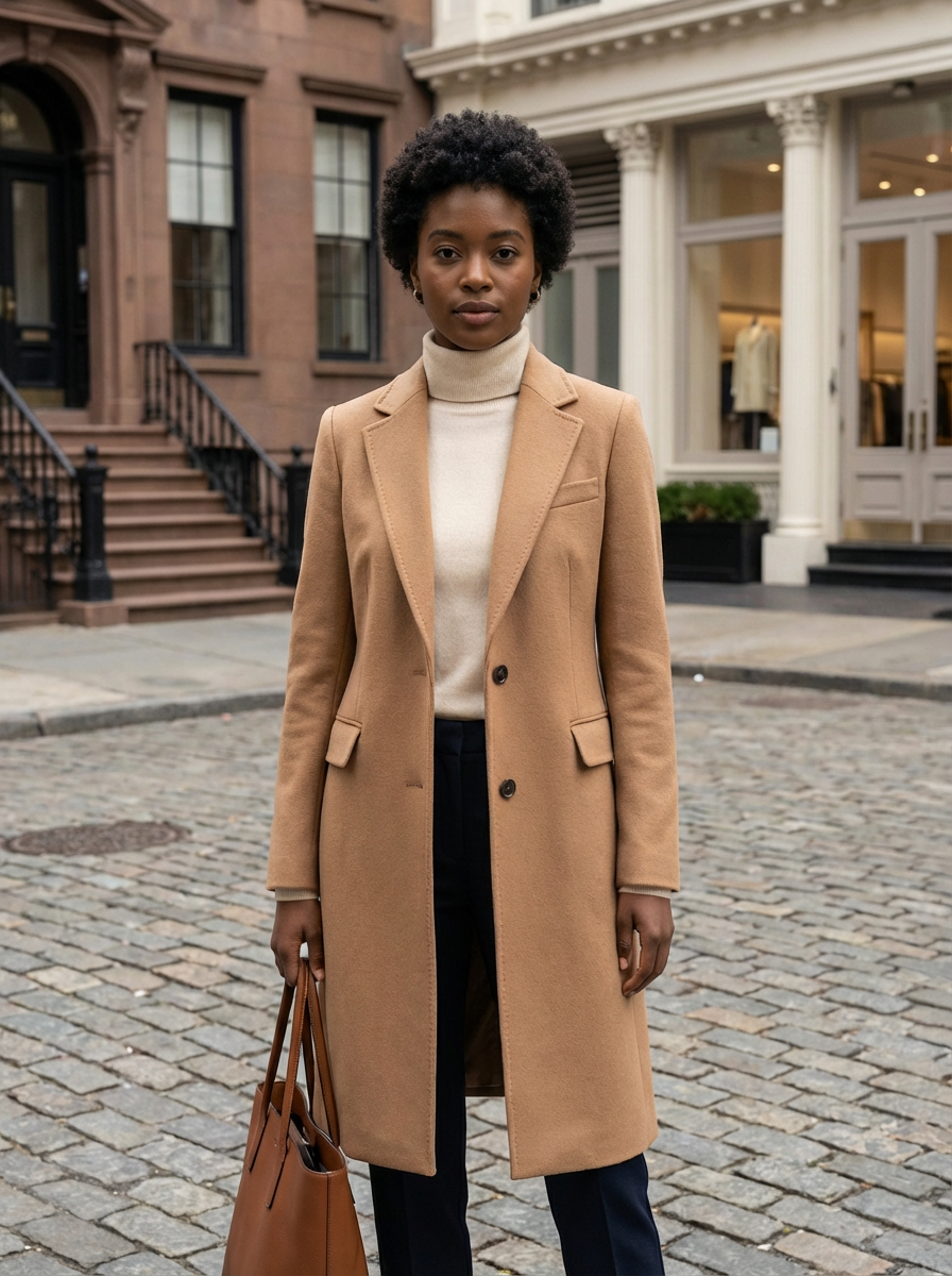 model in quiet luxury outfit, camel coat, quality basics underneath, clean lines, sophisticated urban background