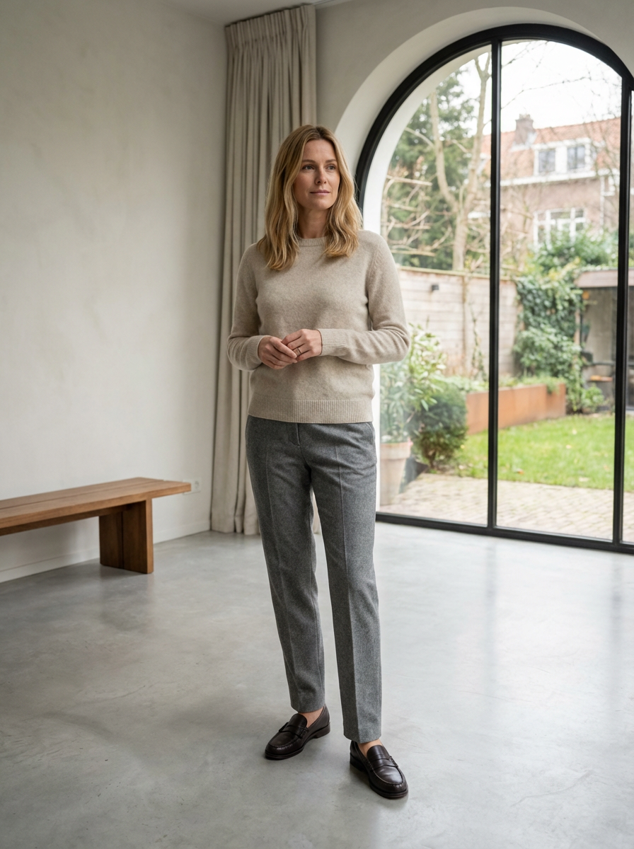 model in quiet luxury style, cashmere sweater in oatmeal, tailored wool trousers, no visible logos, minimalist elegant setting