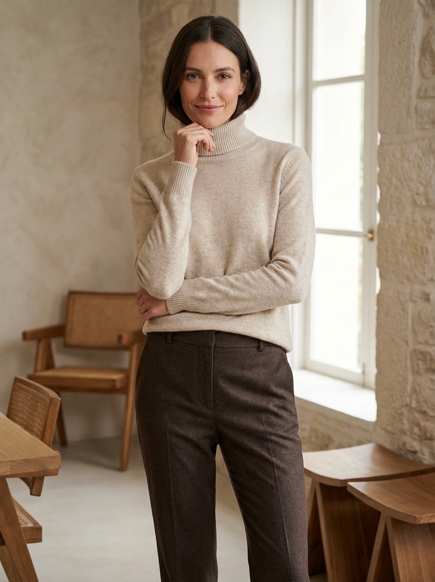 model in quiet luxury style, cashmere sweater in oatmeal, tailored wool trousers, no visible logos, minimalist elegant setting
