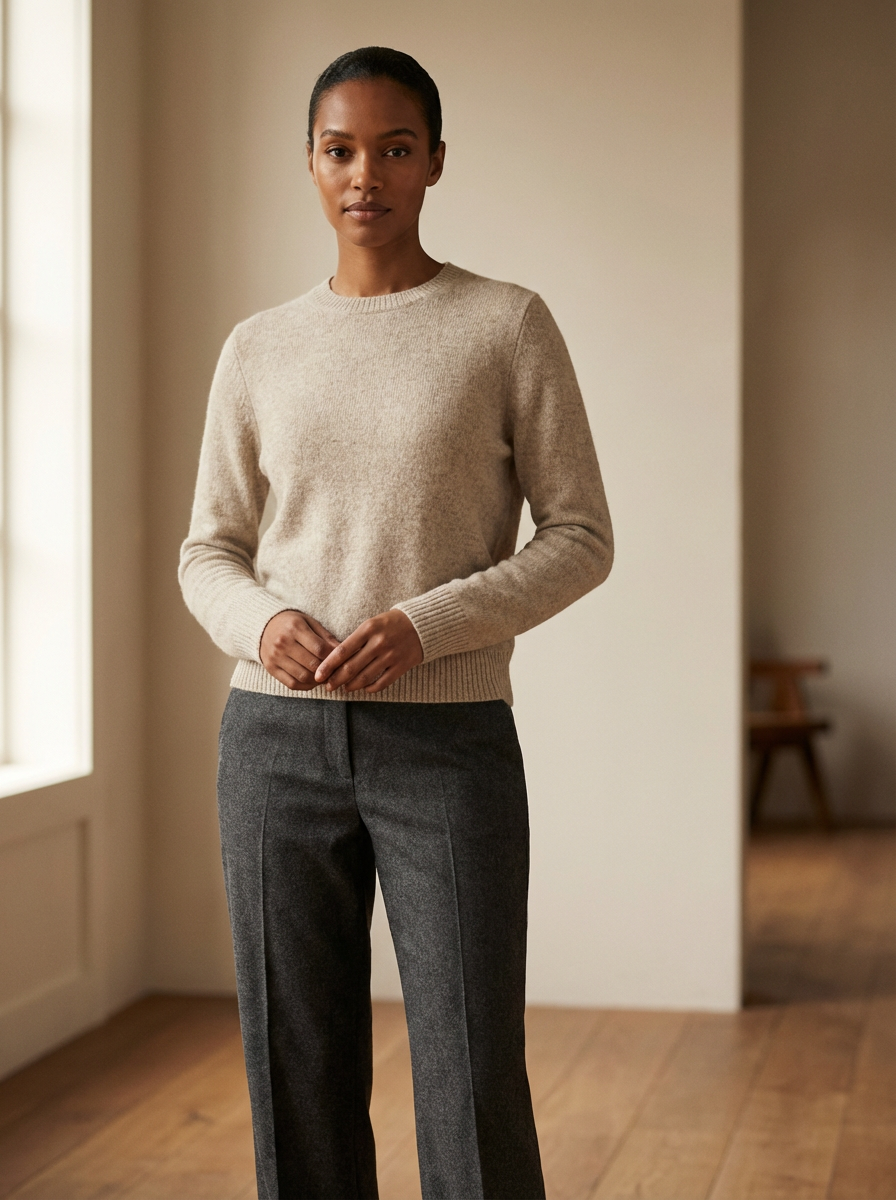 model in quiet luxury style, cashmere sweater in oatmeal, tailored wool trousers, no visible logos, minimalist elegant setting