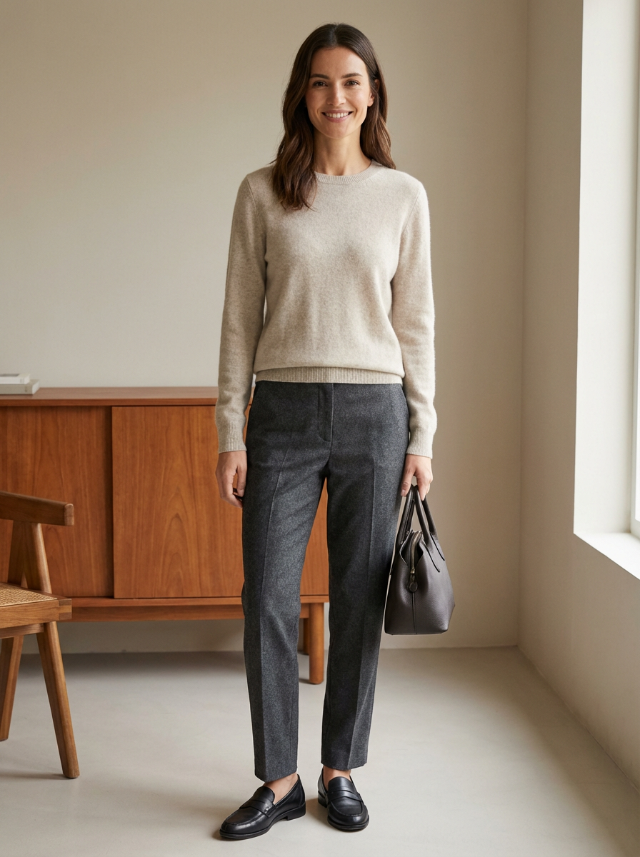 model in quiet luxury style, cashmere sweater in oatmeal, tailored wool trousers, no visible logos, minimalist elegant setting