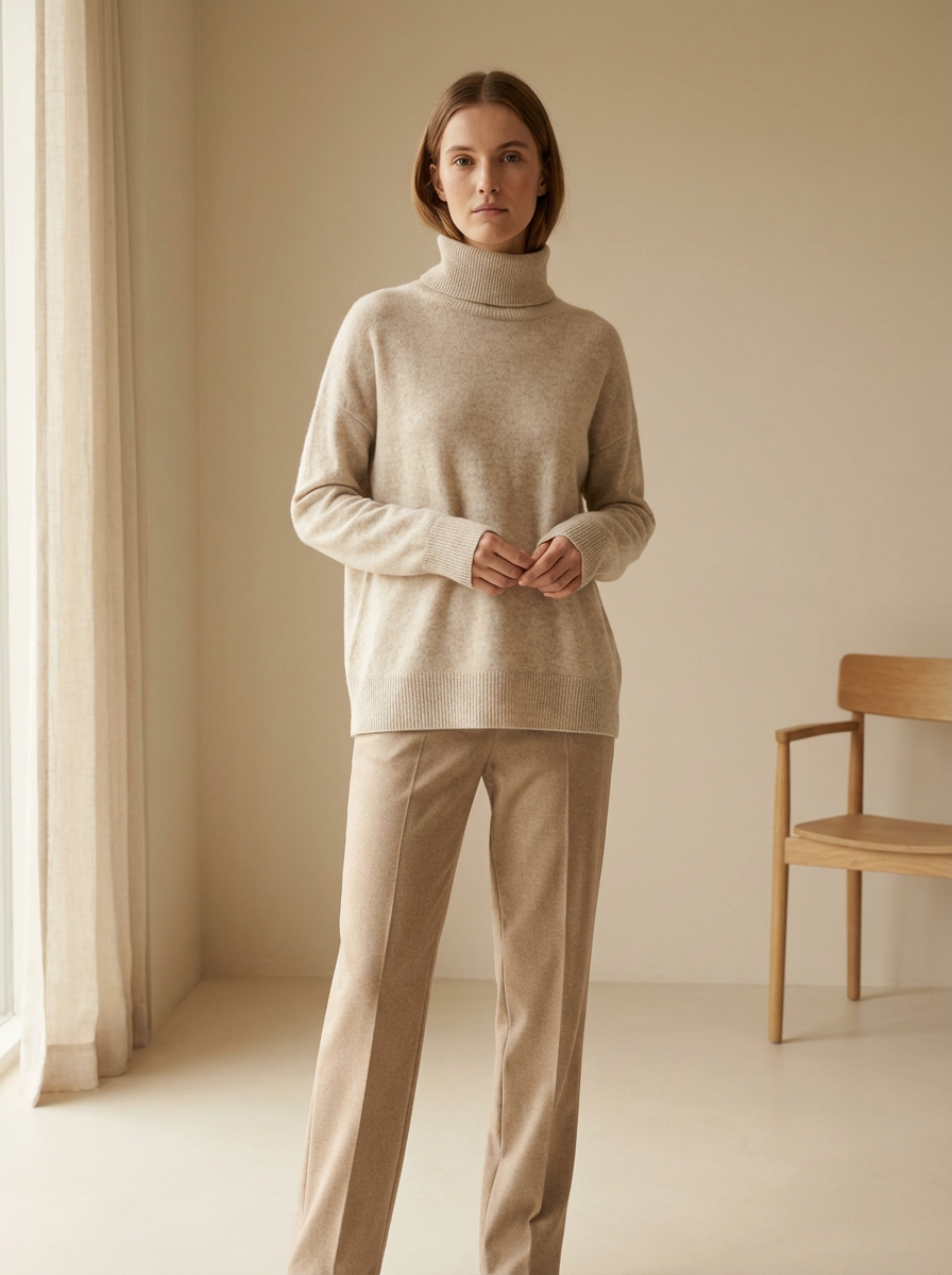 model in quiet luxury style, cashmere sweater in oatmeal, tailored wool trousers, no visible logos, minimalist elegant setting
