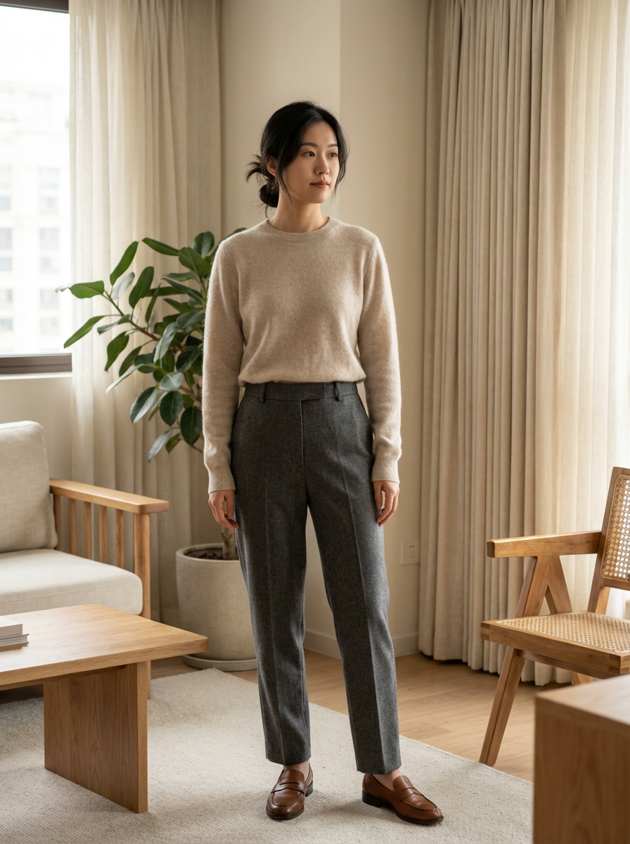 model in quiet luxury style, cashmere sweater in oatmeal, tailored wool trousers, no visible logos, minimalist elegant setting