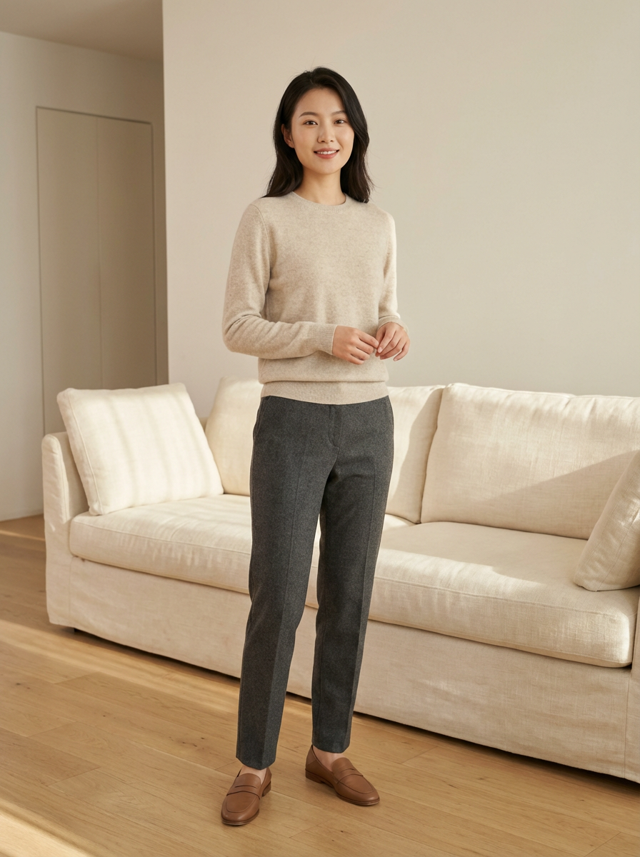 model in quiet luxury style, cashmere sweater in oatmeal, tailored wool trousers, no visible logos, minimalist elegant setting