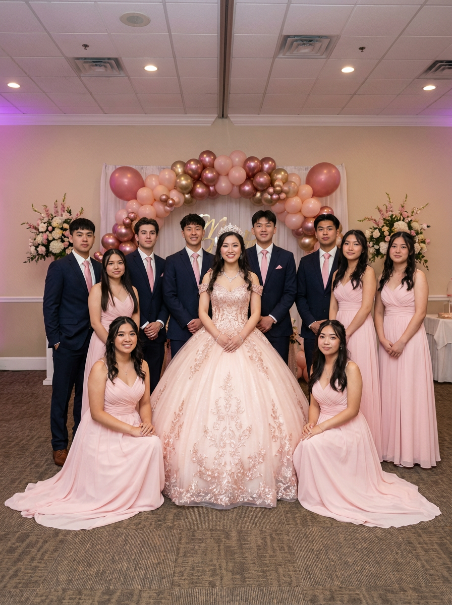 model in quinceanera dress, surrounded by court of honor, matching outfits, formal group arrangement
