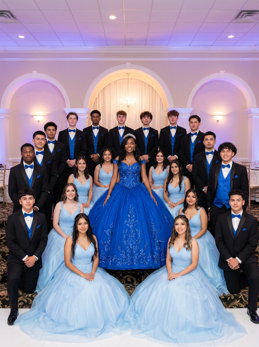 model in quinceanera dress, surrounded by court of honor, matching outfits, formal group arrangement