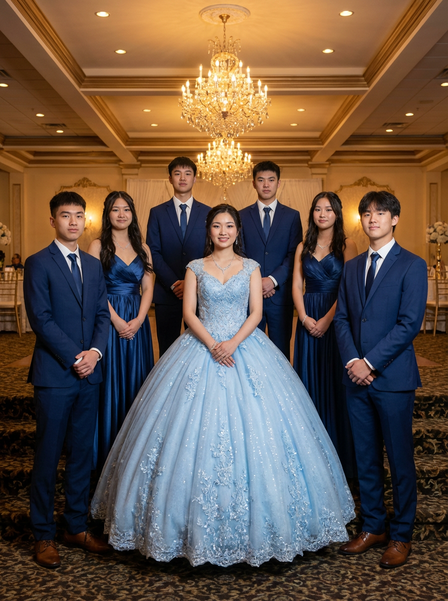 model in quinceanera dress, surrounded by court of honor, matching outfits, formal group arrangement