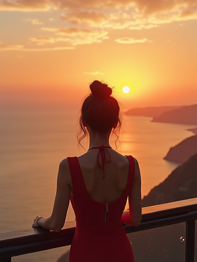 model in resort cocktail dress at rooftop bar with panoramic sunset view over ocean