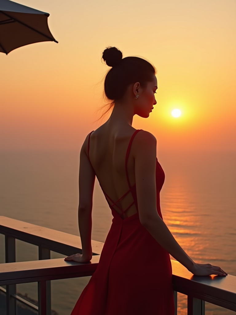 model in resort cocktail dress at rooftop bar with panoramic sunset view over ocean