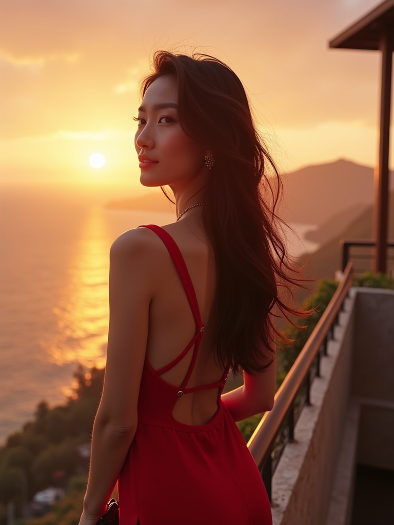model in resort cocktail dress at rooftop bar with panoramic sunset view over ocean
