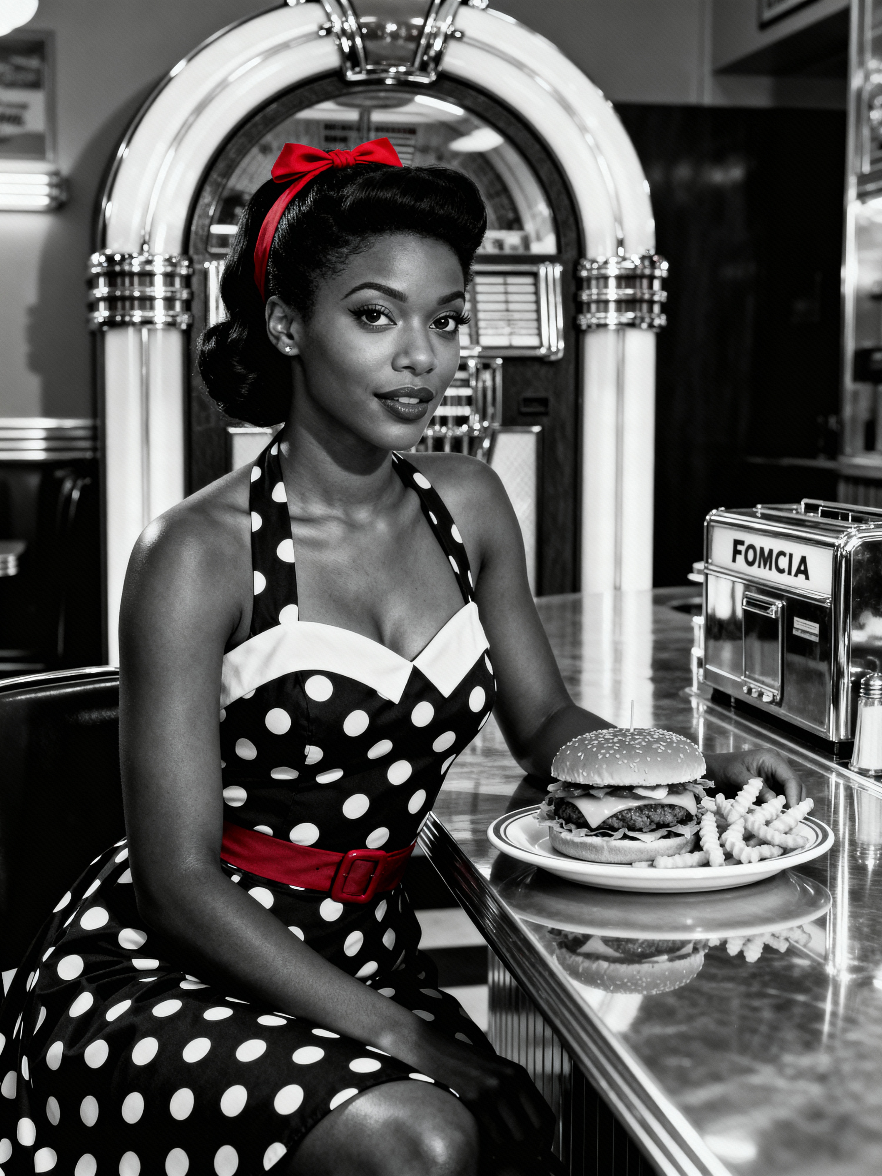 model in retro 1950s diner photo shoot. french fries and one cheeseburger on a plate in front. model wearing 1950s pin up dress and 1950s hair tie