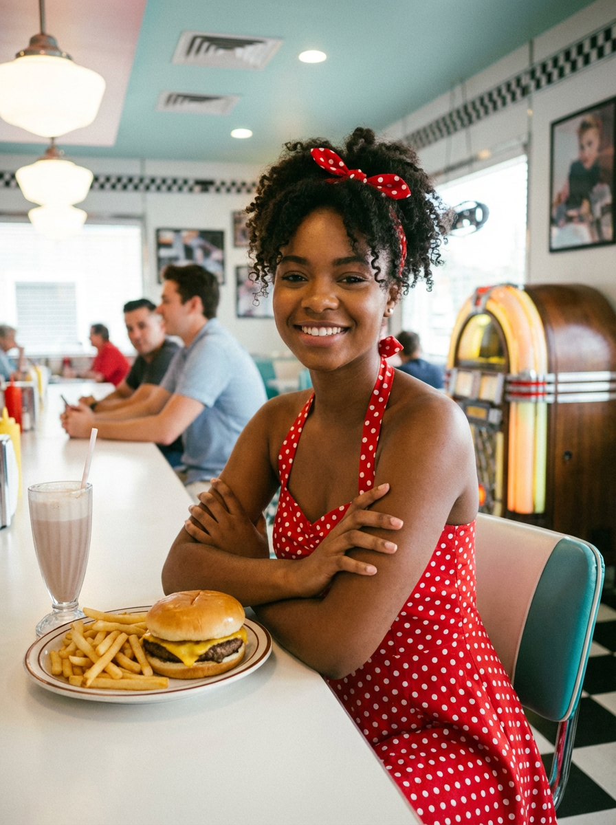 model in retro 1950s diner photo shoot. french fries and one cheeseburger on a plate in front. model wearing 1950s pin up dress and 1950s hair tie