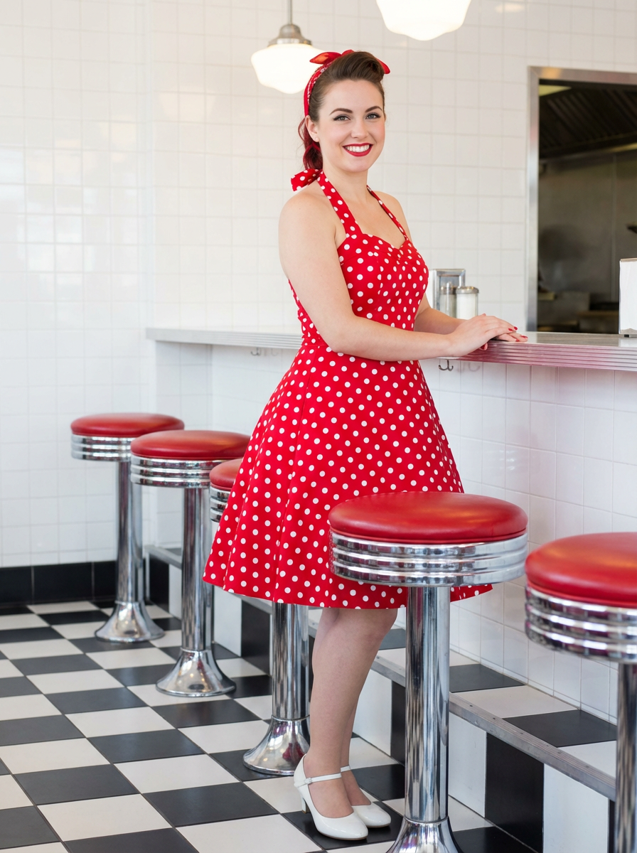 model in retro 1950s diner photo shoot. posing in front of red 1950s barstools. model wearing 1950s pin up dress and 1950s red hair tie. white interior with red seats and black and white flooring.