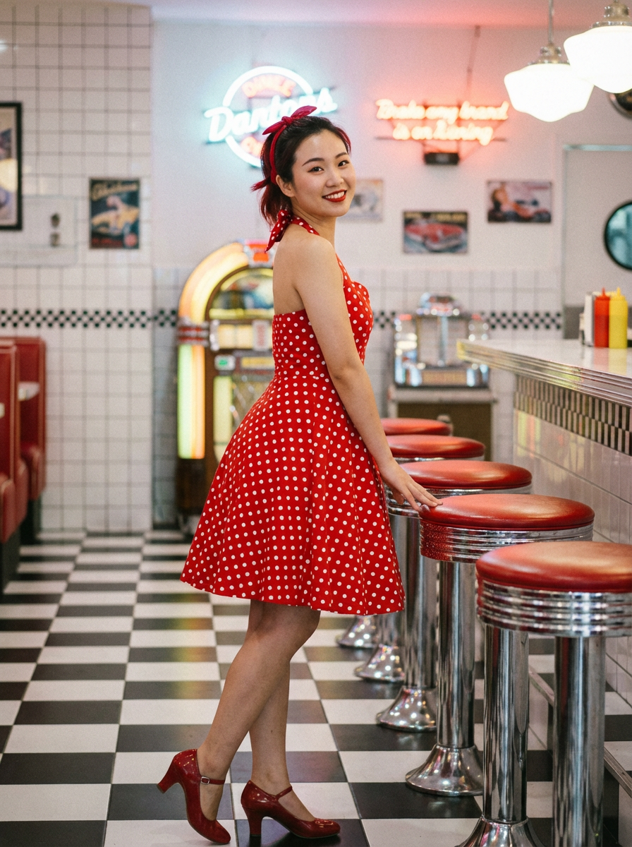 model in retro 1950s diner photo shoot. posing in front of red 1950s barstools. model wearing 1950s pin up dress and 1950s red hair tie. white interior with red seats and black and white flooring.