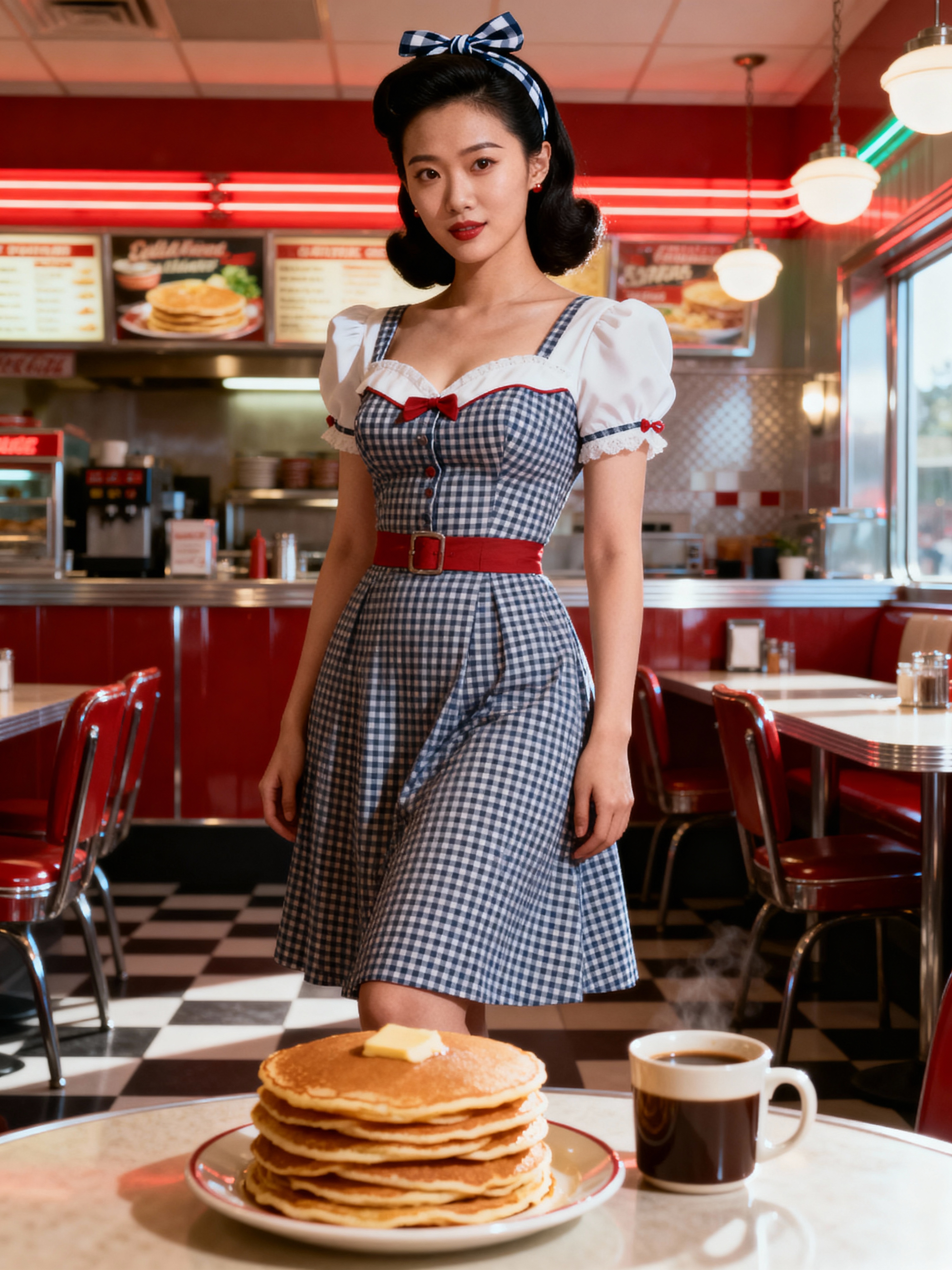 model in retro 1950s diner photo shoot. stack of pancakes and one coffee mug in front. model wearing 1950s pin up dress and 1950s hair tie