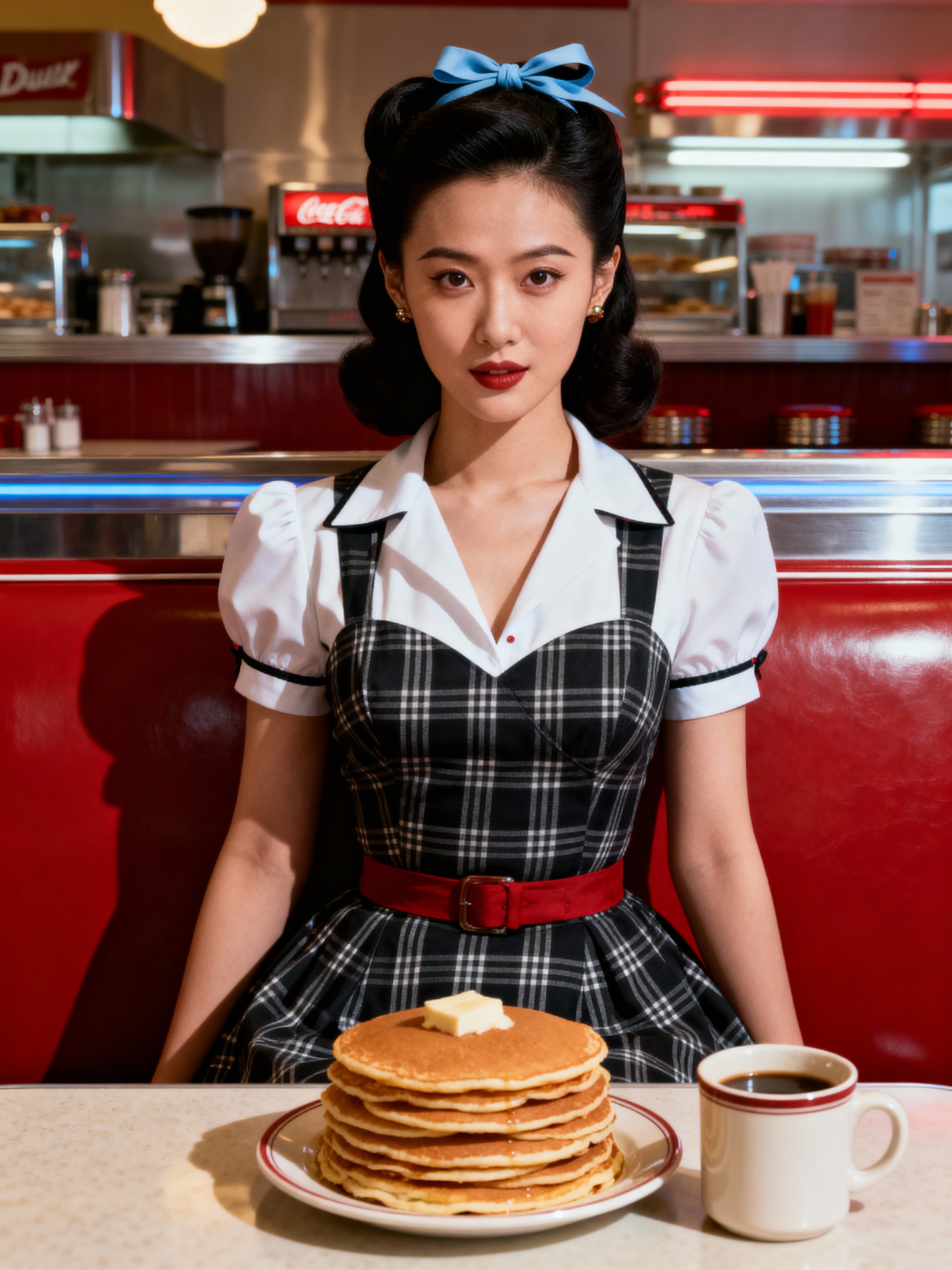 model in retro 1950s diner photo shoot. stack of pancakes and one coffee mug in front. model wearing 1950s pin up dress and 1950s hair tie