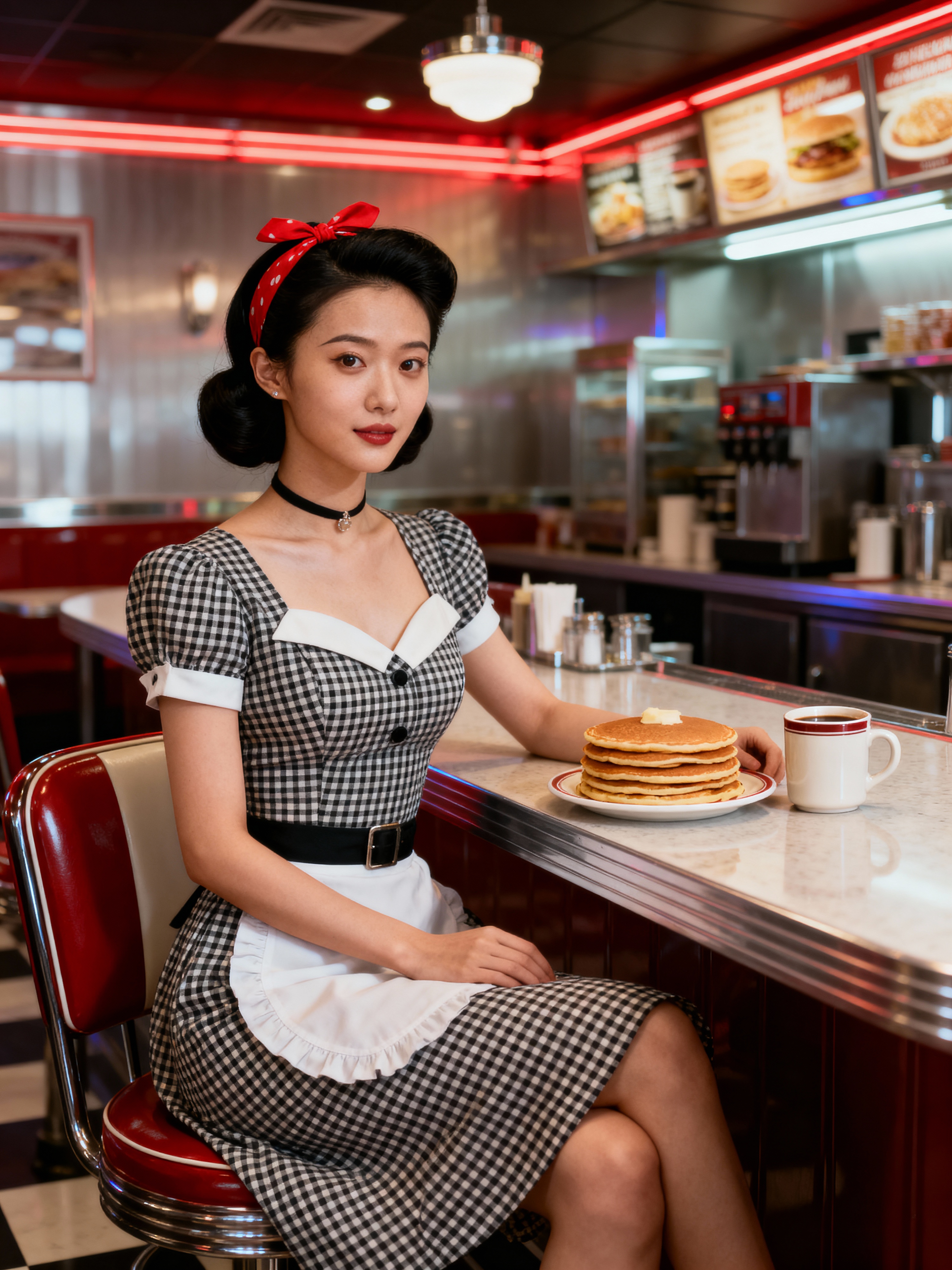 model in retro 1950s diner photo shoot. stack of pancakes and one coffee mug in front. model wearing 1950s pin up dress and 1950s hair tie