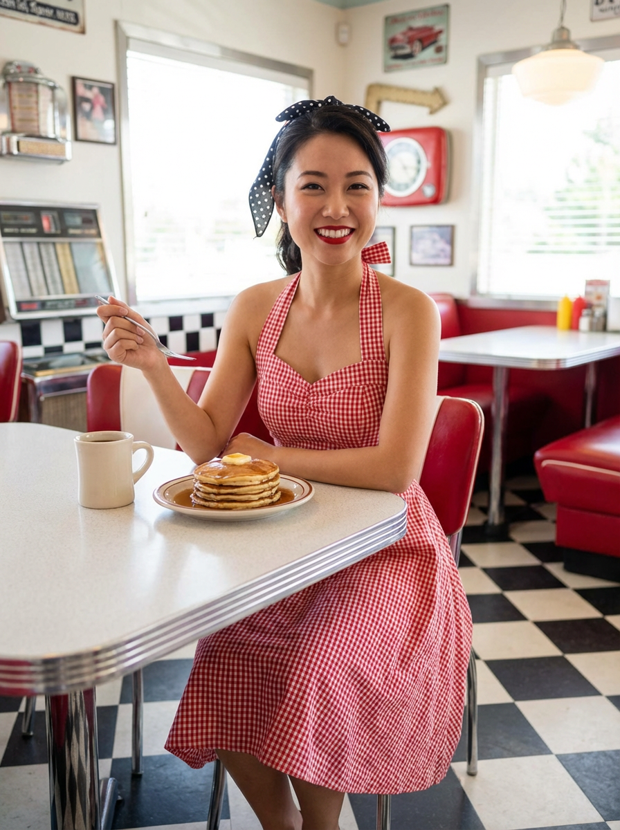 model in retro 1950s diner photo shoot. stack of pancakes and one coffee mug in front. model wearing 1950s pin up dress and 1950s hair tie