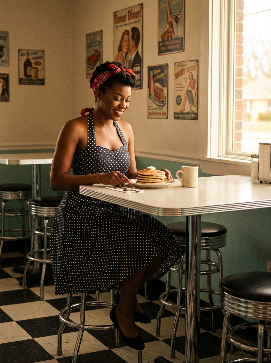 model in retro 1950s diner photo shoot. stack of pancakes and one coffee mug in front. model wearing 1950s pin up dress and 1950s hair tie