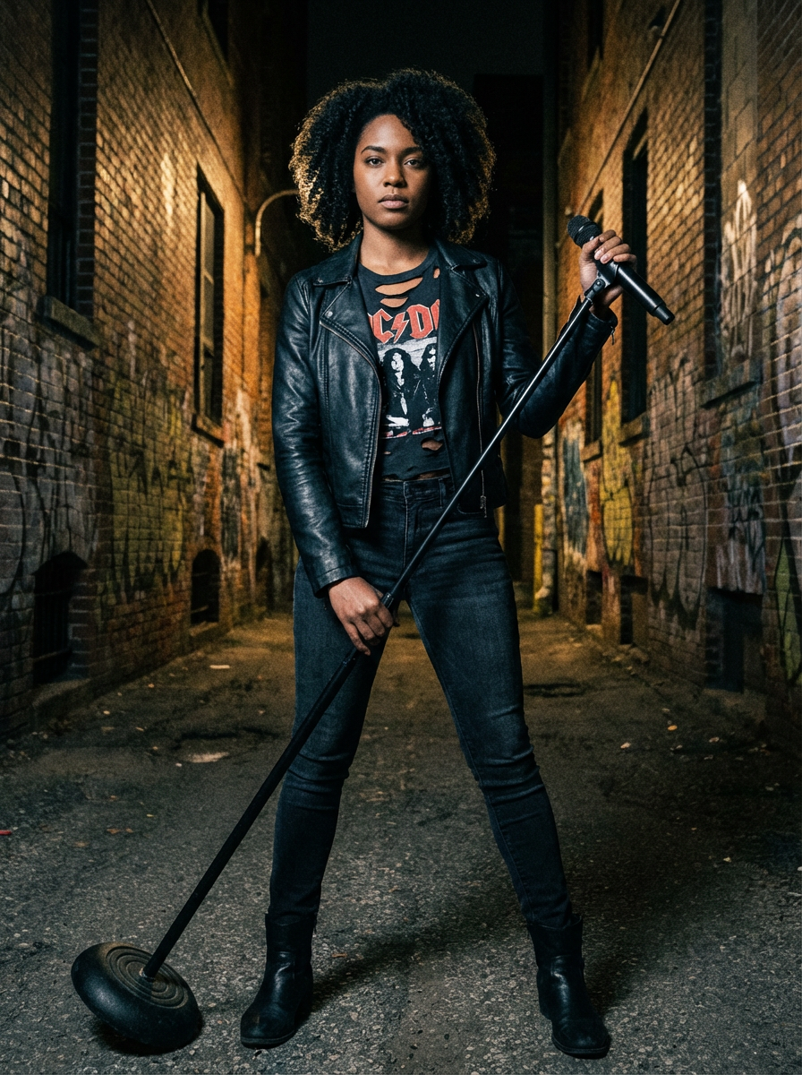 model in rock album cover pose, edgy styling, dramatic lighting, gritty urban or studio setting