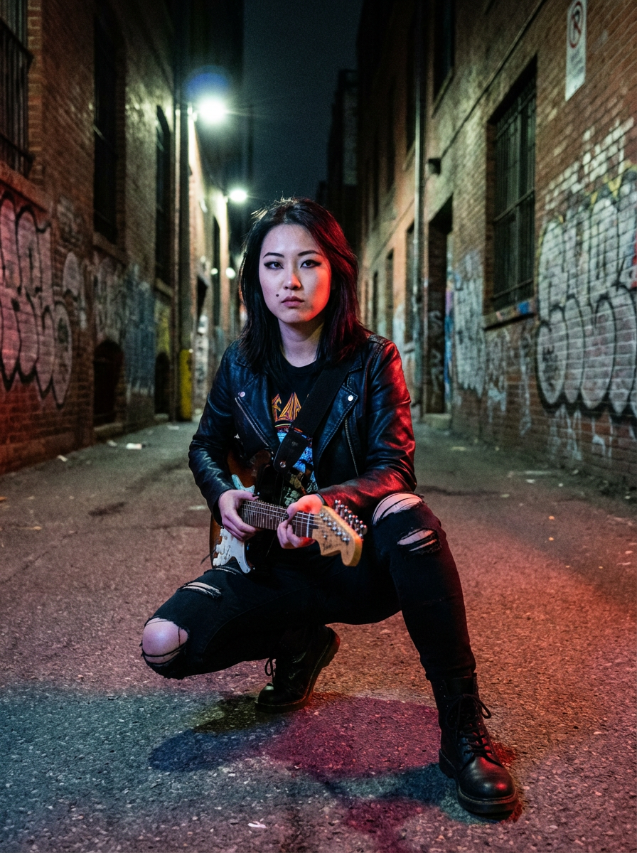 model in rock album cover pose, edgy styling, dramatic lighting, gritty urban or studio setting