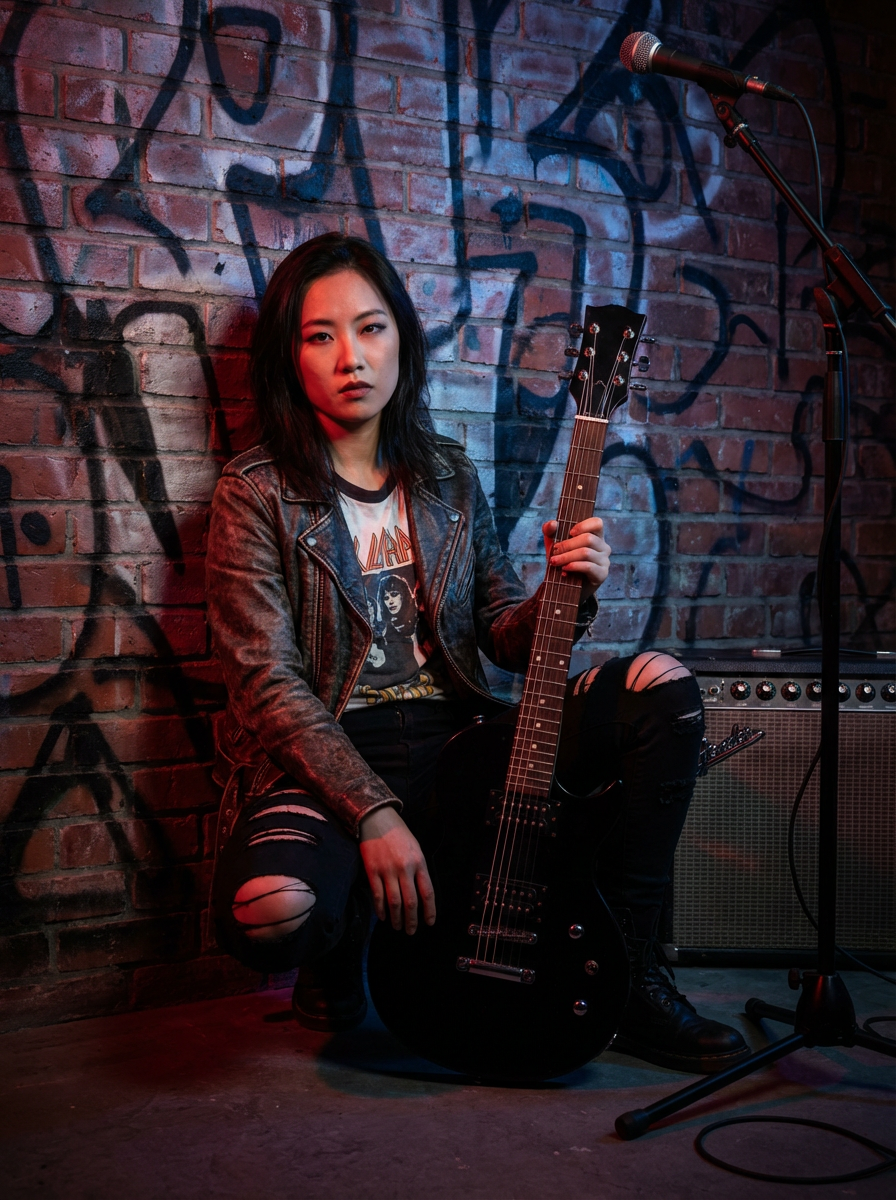 model in rock album cover pose, edgy styling, dramatic lighting, gritty urban or studio setting