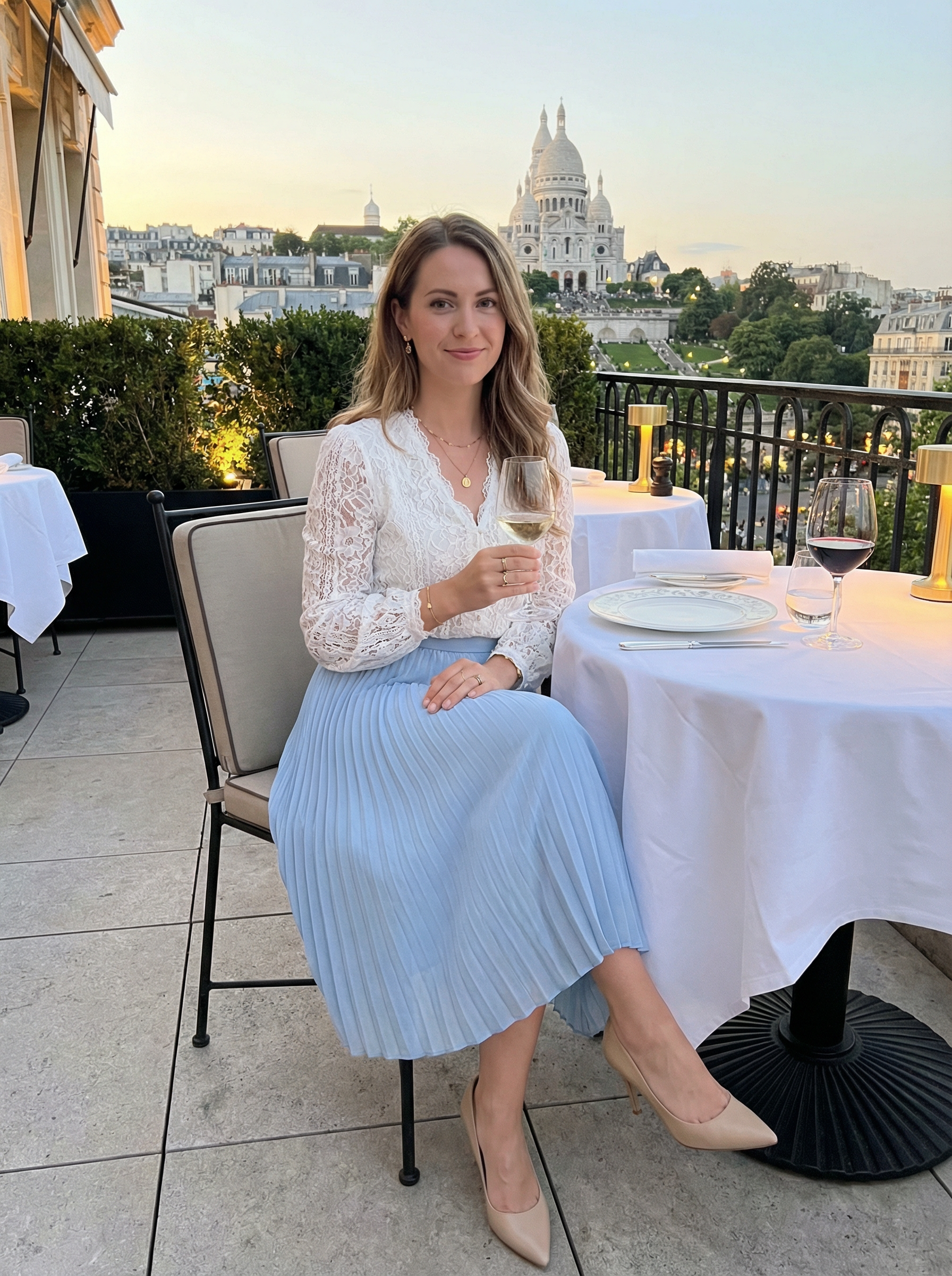 model in romantic blouse, pleated skirt, heels, delicate jewelry dining at elegant restaurant terrace with Sacré-Cœur view, fine dining experience, white tablecloth, wine glasses, evening city lights, sophisticated dining scene