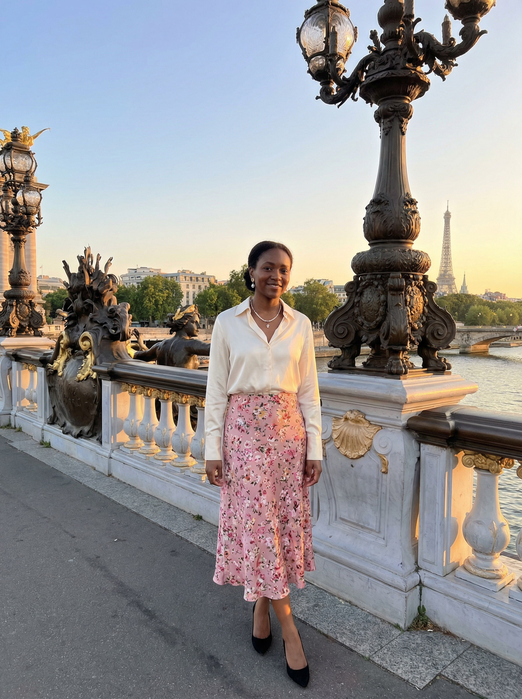 model in romantic midi skirt, silk blouse, heels, pearl jewelry on Pont Alexandre III bridge at sunset, ornate bridge details, Seine river below, golden romantic lighting, classic Parisian romance, architectural beauty