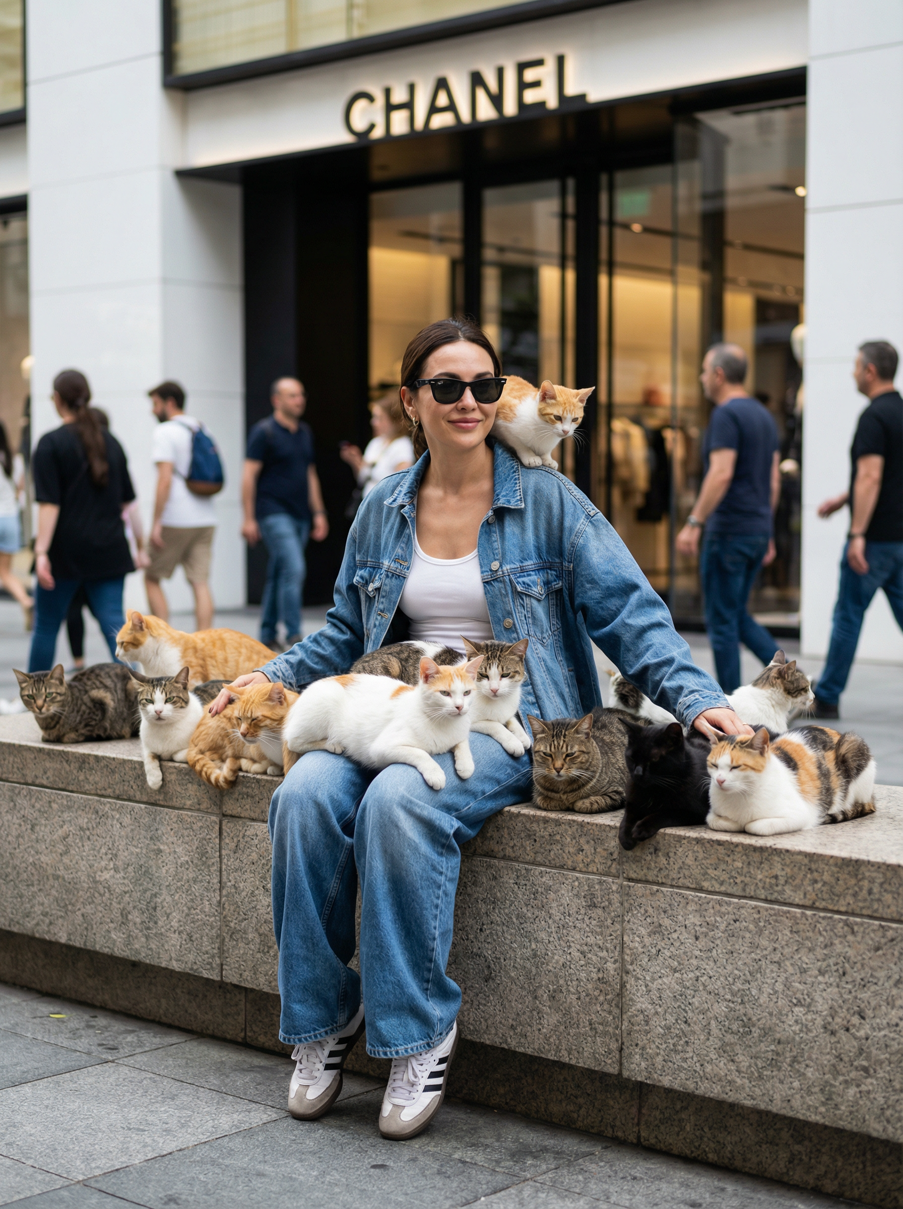 model in runway-inspired denim set: oversized denim jacket, wide-leg jeans, white tank, sneakers, sunglasses sitting on a stone ledge outside a high-end boutique on a busy city street, 15 cats of different colors lounging on and around the model like a fashion entourage, candid street photo vibe, natural daylight, shallow depth of field