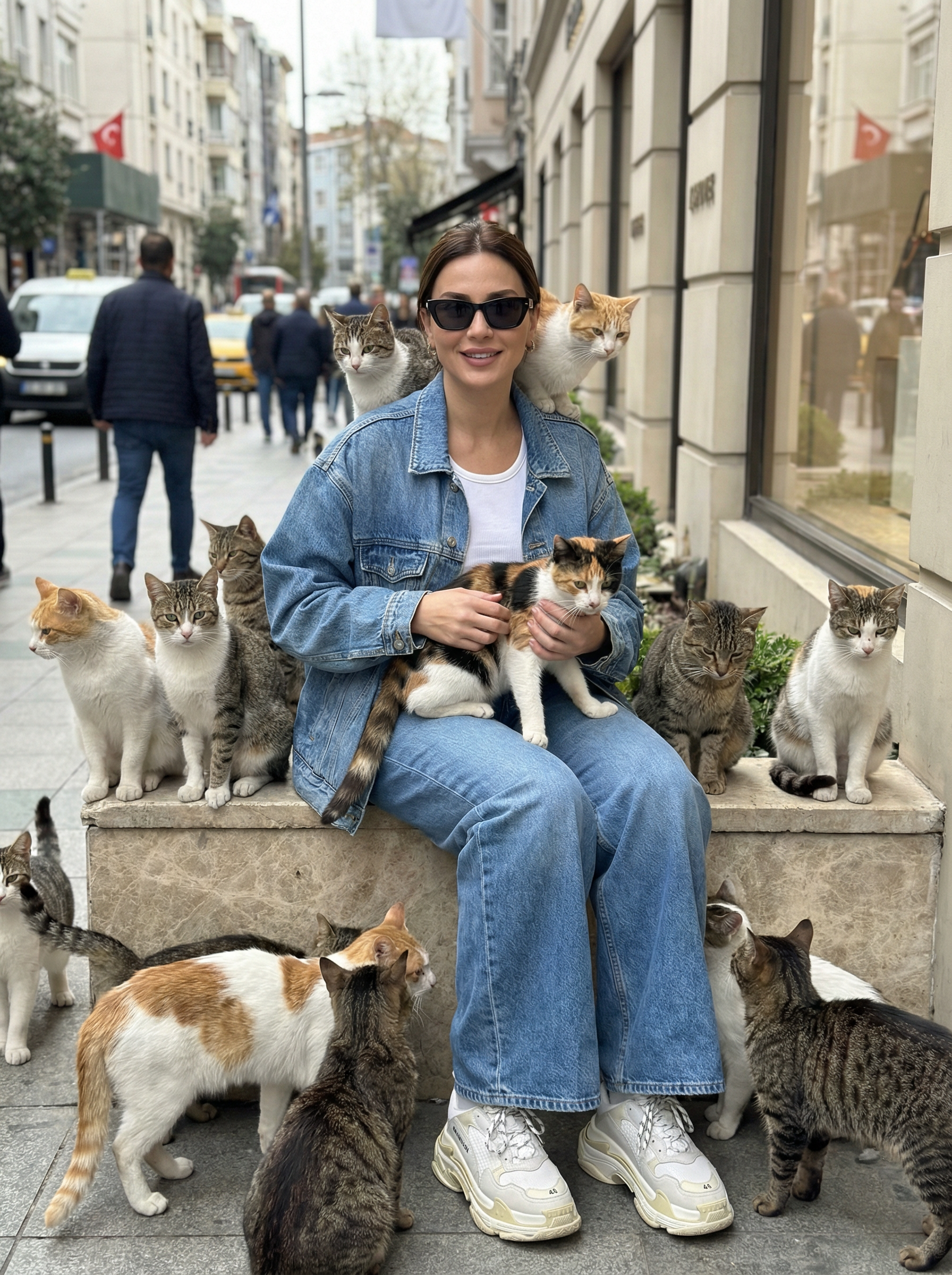 model in runway-inspired denim set: oversized denim jacket, wide-leg jeans, white tank, sneakers, sunglasses sitting on a stone ledge outside a high-end boutique on a busy city street, 15 cats of different colors lounging on and around the model like a fashion entourage, candid street photo vibe, natural daylight, shallow depth of field