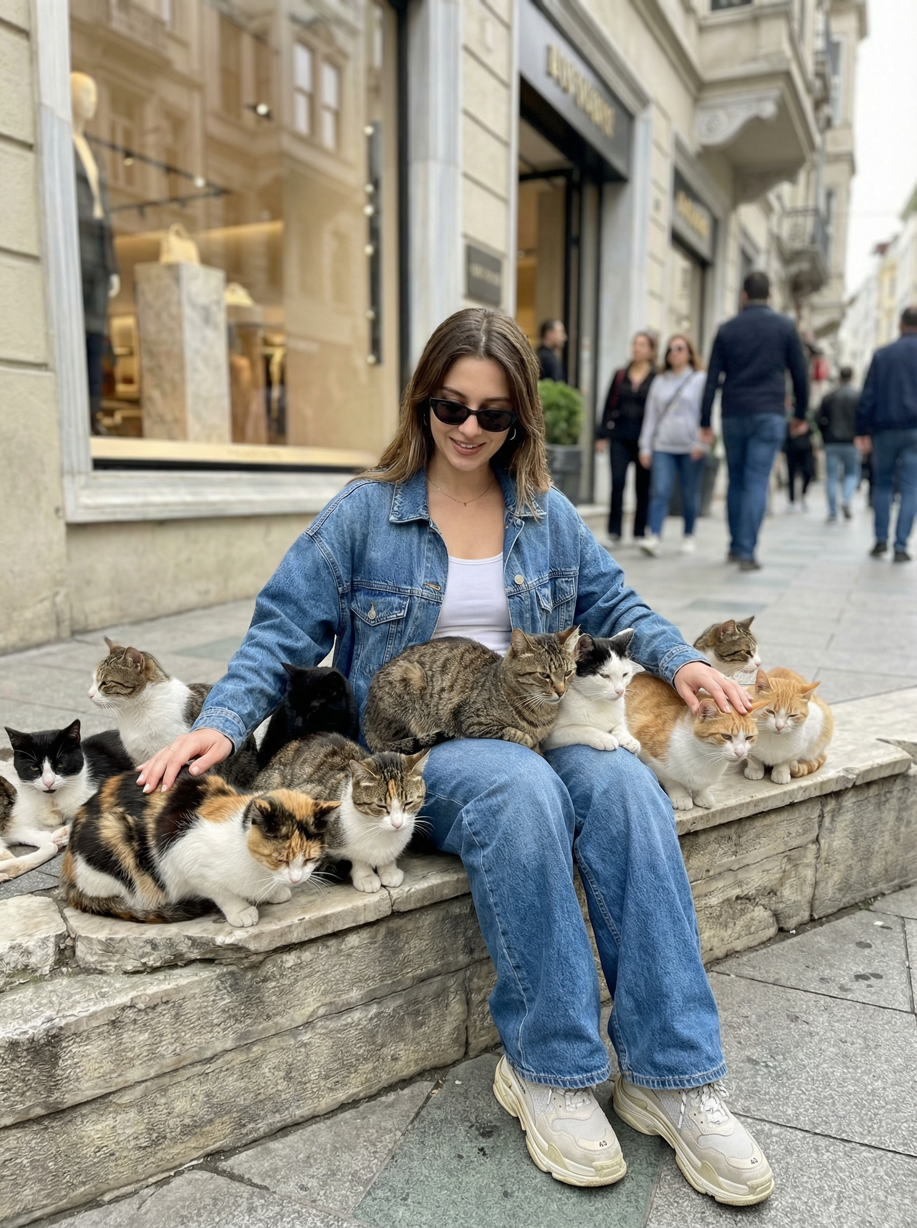 model in runway-inspired denim set: oversized denim jacket, wide-leg jeans, white tank, sneakers, sunglasses sitting on a stone ledge outside a high-end boutique on a busy city street, 15 cats of different colors lounging on and around the model like a fashion entourage, candid street photo vibe, natural daylight, shallow depth of field