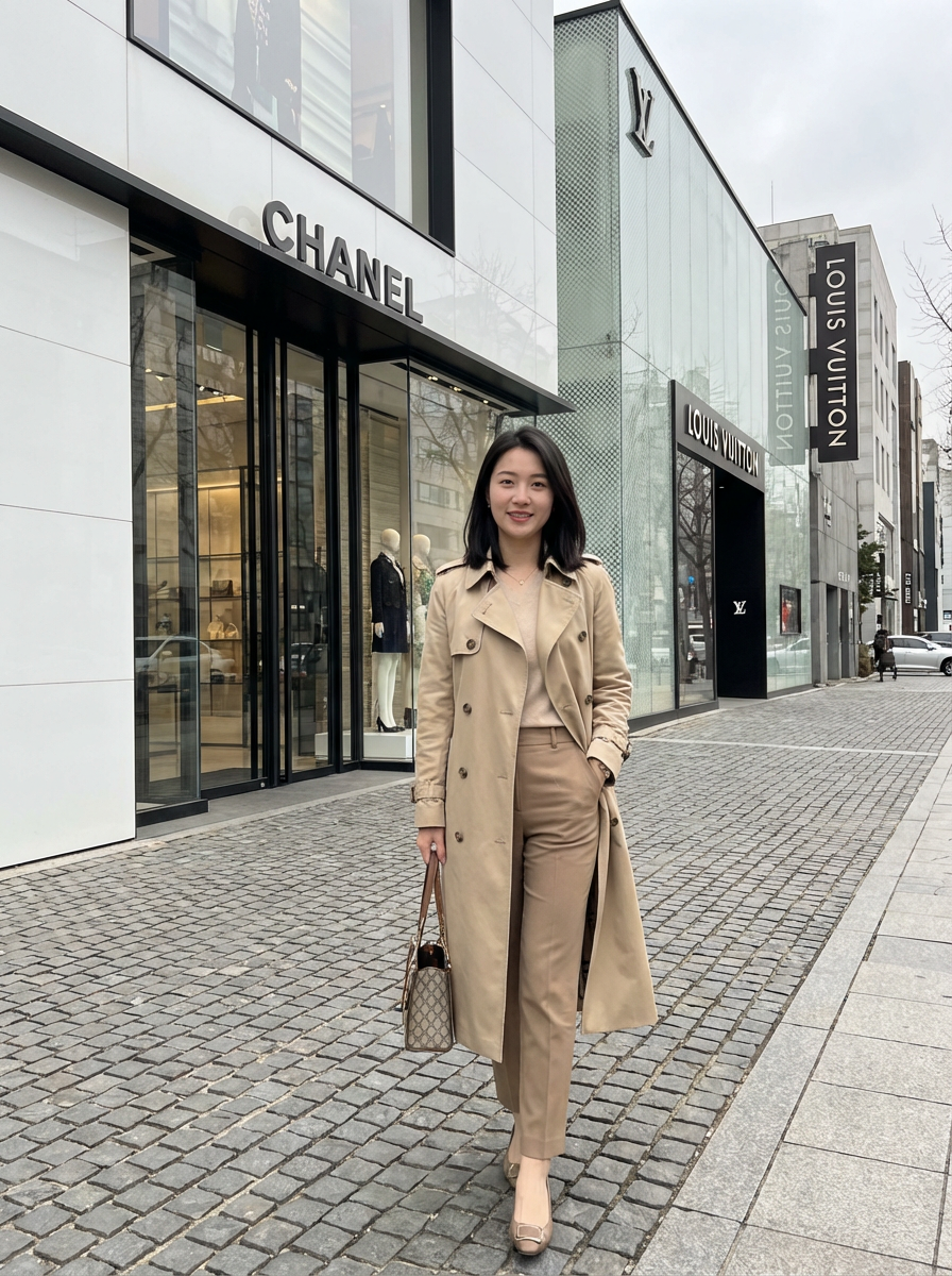 model in Seoul in Gangnam in Cheongdamdong Luxury Shopping street. stores visible in background