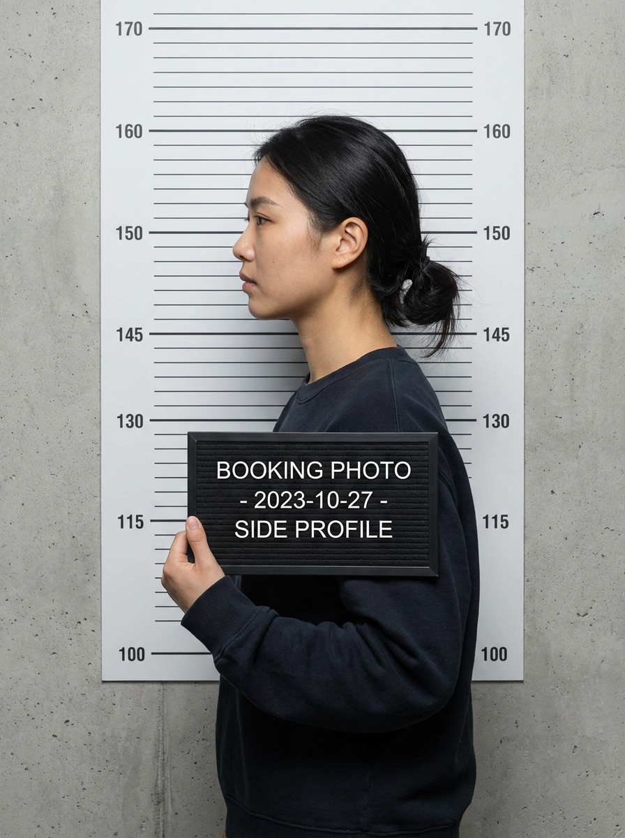 model in side profile mugshot, booking photo style, neutral expression, measurement backdrop