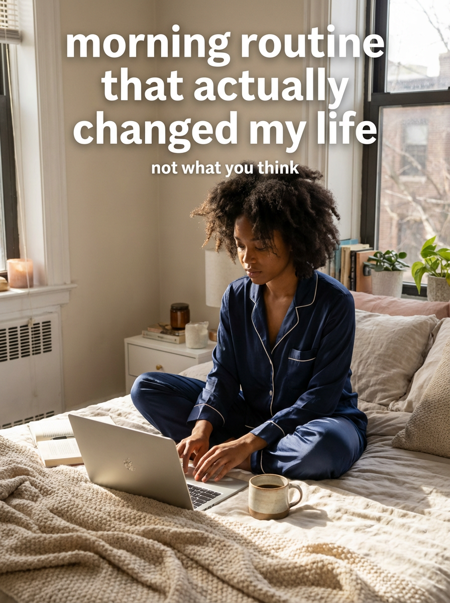 model in silk pajama set sitting on unmade bed with laptop, messy hair, coffee cup nearby, morning sunlight, cozy bedroom aesthetic. TikTok text overlay: "morning routine that actually changed my life" smaller text: "(not what you think)" , do not show tiktok interface