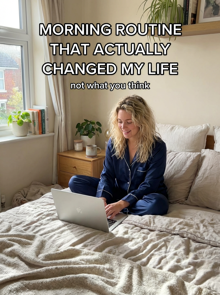 model in silk pajama set sitting on unmade bed with laptop, messy hair, coffee cup nearby, morning sunlight, cozy bedroom aesthetic. TikTok text overlay: "morning routine that actually changed my life" smaller text: "(not what you think)" , do not show tiktok interface