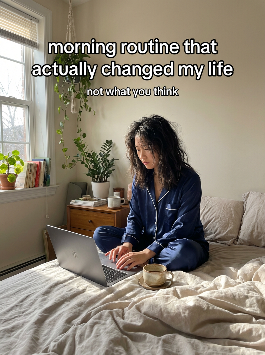 model in silk pajama set sitting on unmade bed with laptop, messy hair, coffee cup nearby, morning sunlight, cozy bedroom aesthetic. TikTok text overlay: "morning routine that actually changed my life" smaller text: "(not what you think)" , do not show tiktok interface
