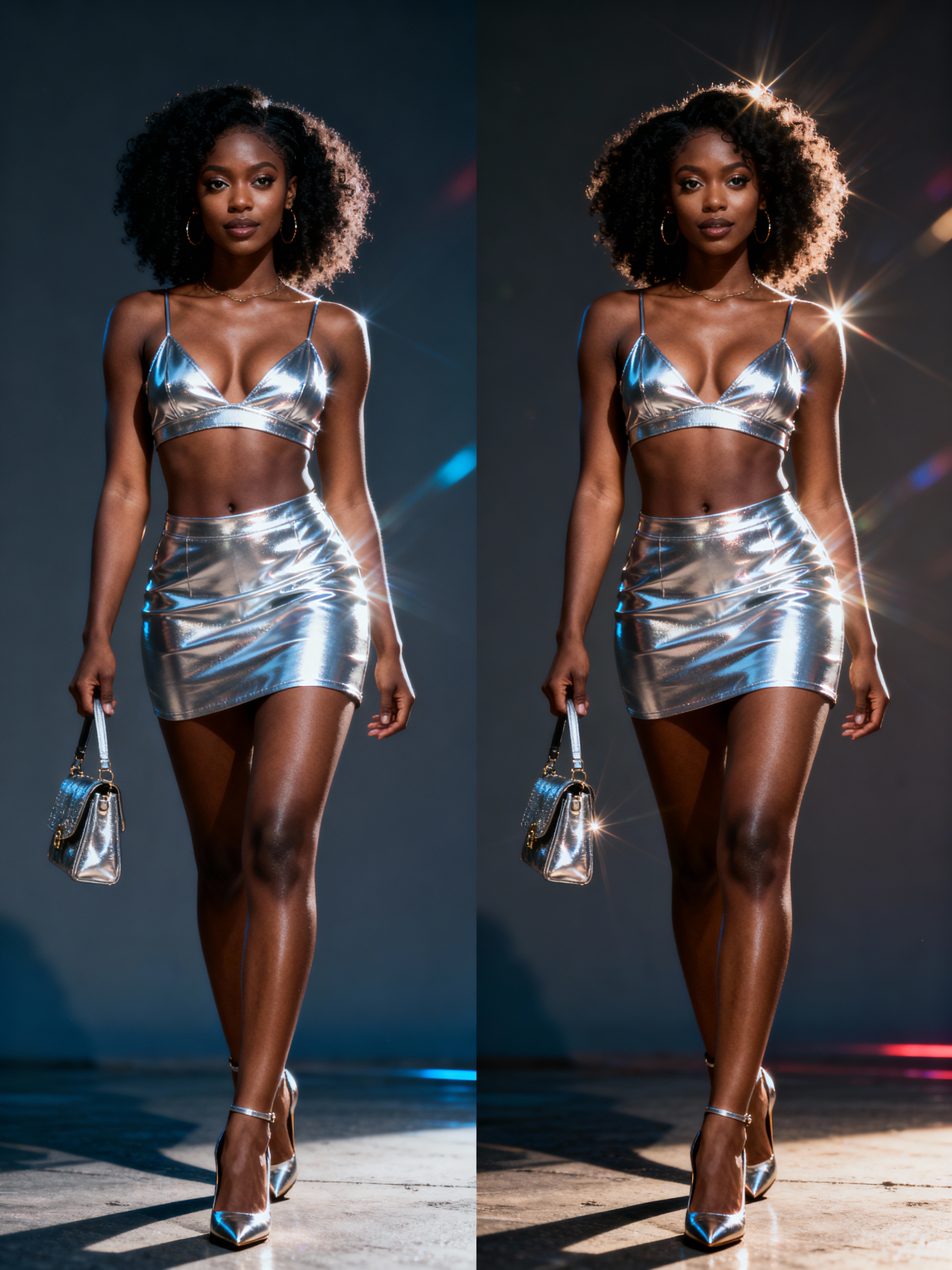 model in silver metallic glossy style, wearing metallic glossy shiny glossy mini skirt, metallic glossy shiny glossy crop top, metallic glossy shiny glossy purse, metallic glossy heels