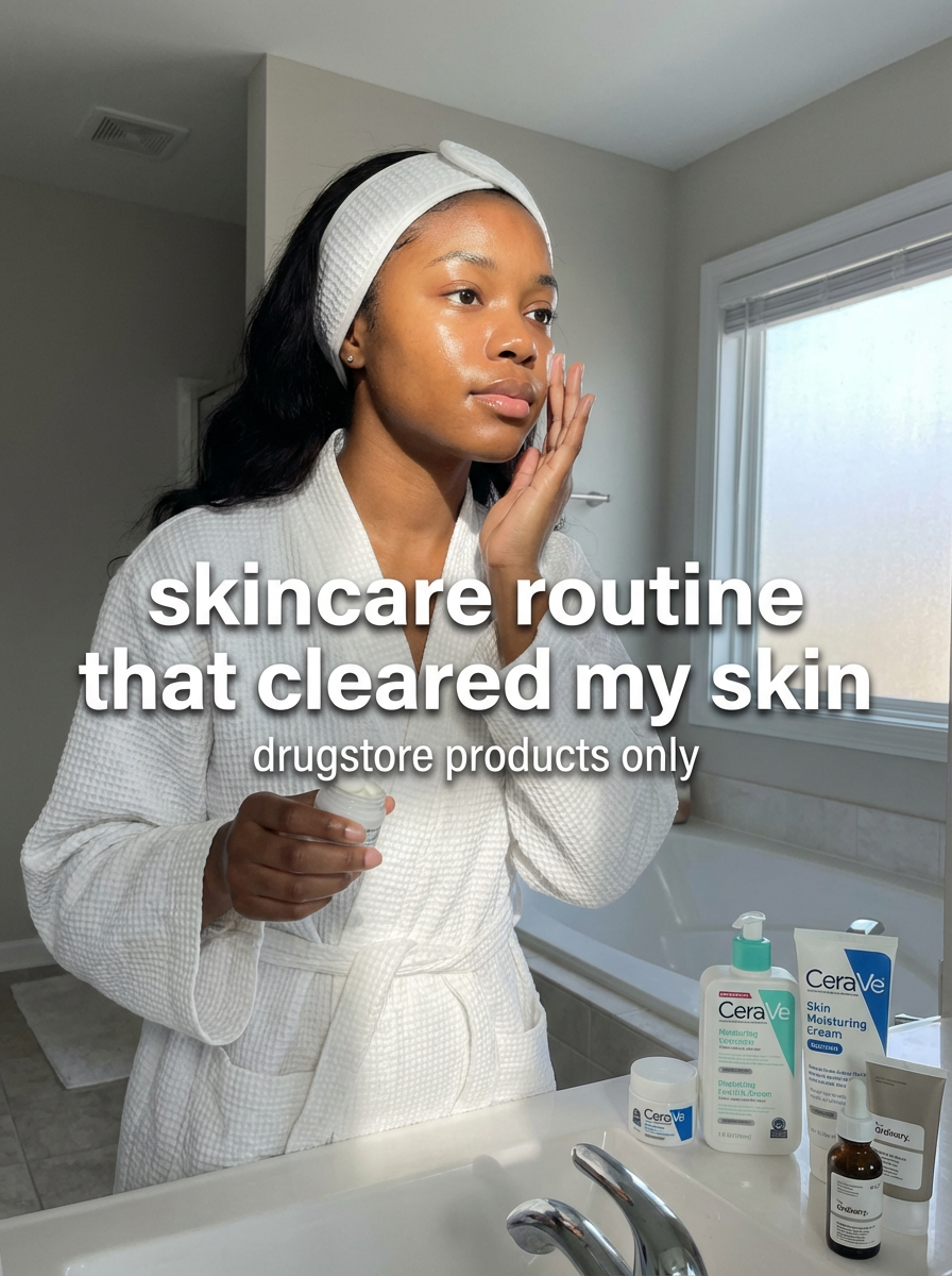 model in skincare routine outfit in bathroom with skincare products, glowing skin, soft lighting. TikTok text overlay: "skincare routine that cleared my skin" smaller text: "(drugstore products only)" , do not show tiktok interface