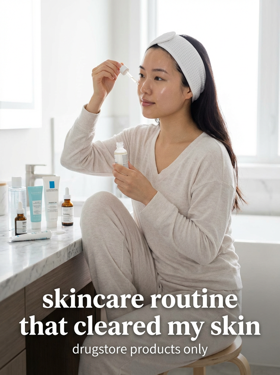 model in skincare routine outfit in bathroom with skincare products, glowing skin, soft lighting. TikTok text overlay: "skincare routine that cleared my skin" smaller text: "(drugstore products only)" , do not show tiktok interface