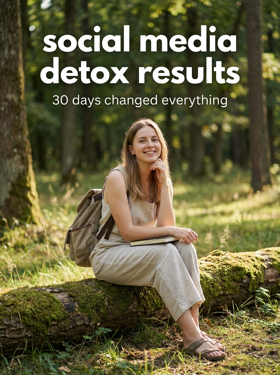model in social media detox outfit in nature or peaceful setting, phone put away, serene expression, natural lighting. TikTok text overlay: "social media detox results" smaller text: "(30 days changed everything)" , do not show tiktok interface
