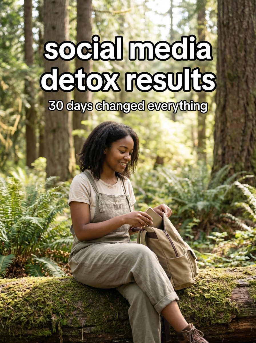 model in social media detox outfit in nature or peaceful setting, phone put away, serene expression, natural lighting. TikTok-style text overlay with white text with black outline: "social media detox results" smaller text: "(30 days changed everything)" , do not show tiktok interface or logo